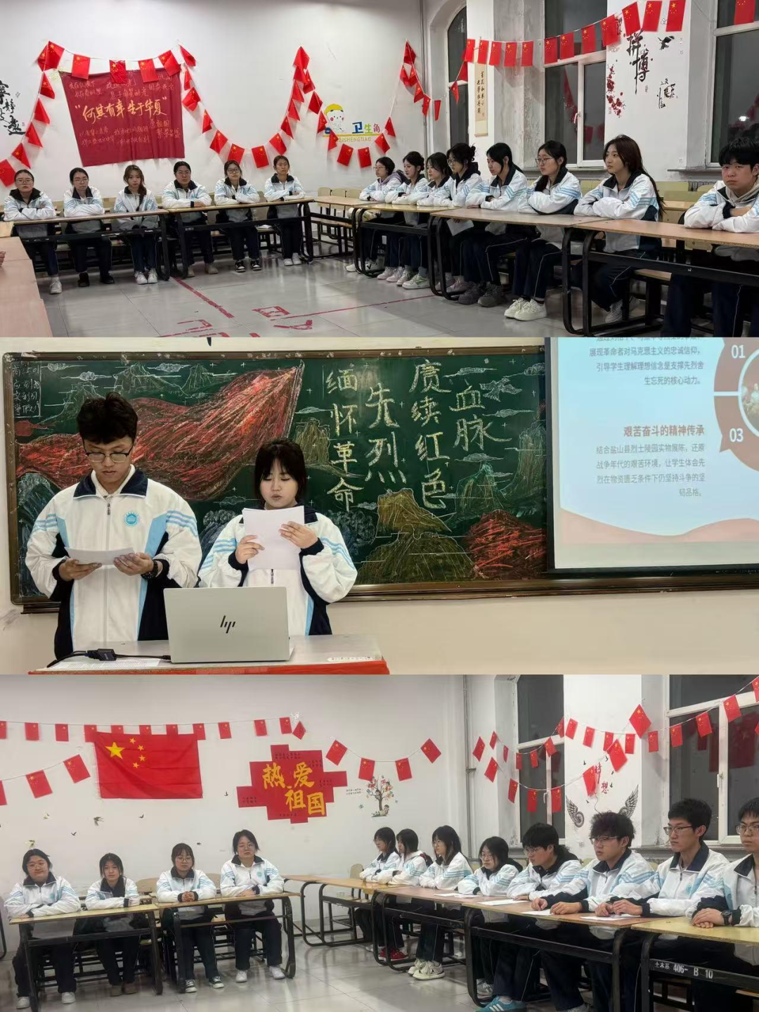 本次班会活动在各班团支书的带领下顺利开展。首先,由主持人通过PPT对革命先烈典型事迹、红色精神内涵、红色历史发展及当代传承意义进行讲解。其次,开展“红色记忆话初心”互动分享会,邀请学生结合所学所知,讲述革命先烈的英雄事迹、红色经典故事和分享自身接触红色文化的经历与感悟;随后组织全体同学观看红色主题影片,并随机邀请5名同学结合影片内容,分享当代大学生应如何传承红色精神、赓续红色血脉。最后,每位同学写下一句致敬革命先烈的寄语,随机选取6名同学进行现场朗读,展现新时代大学生的爱国情怀与使命担当,由各班团支书总结本次班会开展情况。